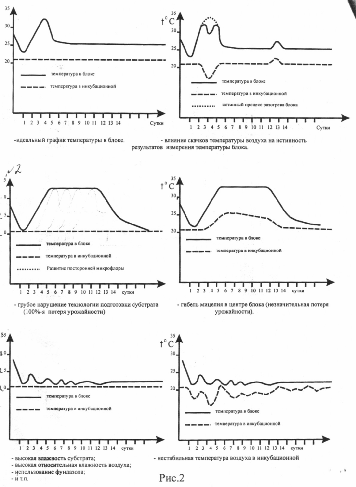 Температурный график: является главным видом контроля за состоянием субстратного блока. Измерение температуры в блоке производится на расстоянии 10 см в глубину. График должен иметь только один пик (на 3-4 сутки) Рис. 2;