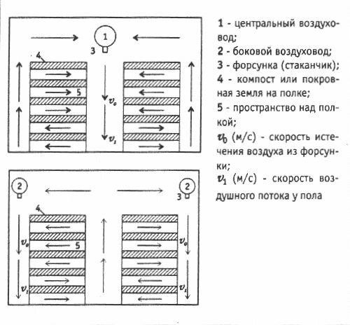 Существует стандартная схема устройства вентиляции, применяемая в грибном производстве.