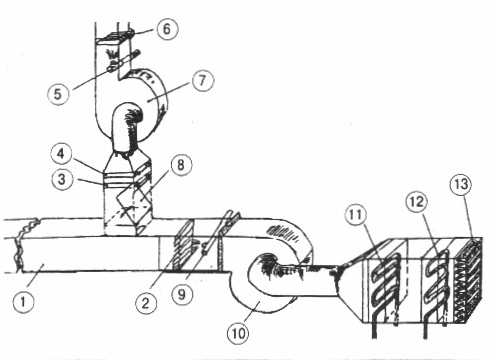 Грубый фильтр => легкий фильтр => обогреватель => регулировочный клапан => поддон для стока конденсата => охладитель => через 1,5 м нагреватель => вентилятор с увлажнителем ( форсунка пара, пар низкого давления, до 0.5 атм , чтобы не образовывать обильный конденсат) или смачивание лопастей (водяные стенки, мелкодисперсное распыление). Кондиционер 10-15°С выдает воздух 100% влажности.